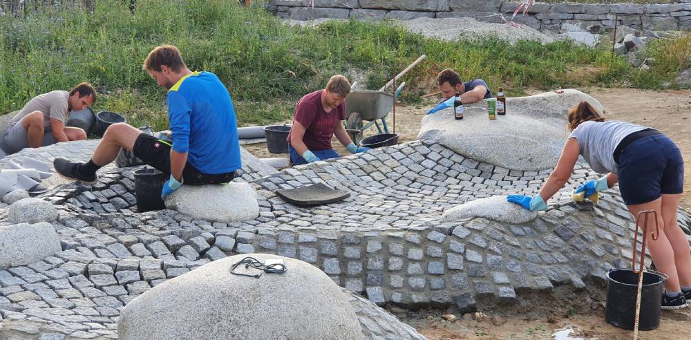 Eltern und Kinder gestalten die Steinbeläge. Das Miteinbeziehen vom